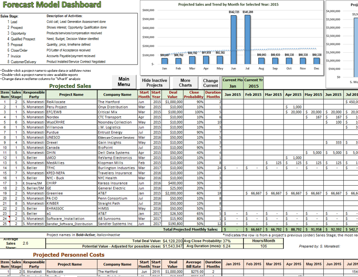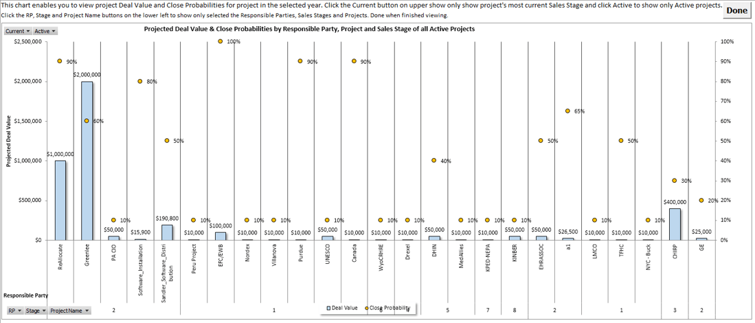 EMOC presents a “birds-eye view” of work activities associated with the pursuit of revenue (including marketing, sales and delivery workflows). Its interactive dashboard, tables and charts enable management, sales, delivery and administrative personnel to monitor their pipeline.