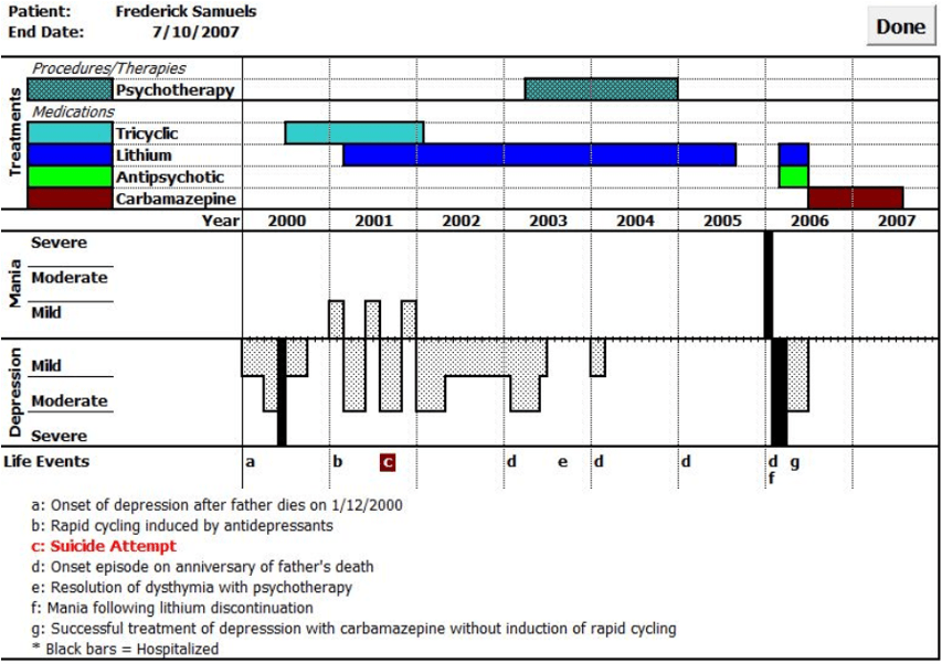 This tool depicts a person’s mental health status, treatments, and significant life events over time in a format that is easy to use and understand. The example below covers seven years of a patient with bipolar disorder that shows which combination of medications and therapy had the best result in controlling the patient's mood, as well as events associated with mood instability. Note that similar charts can be constructed for many other disorders.