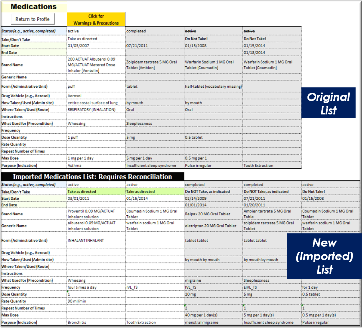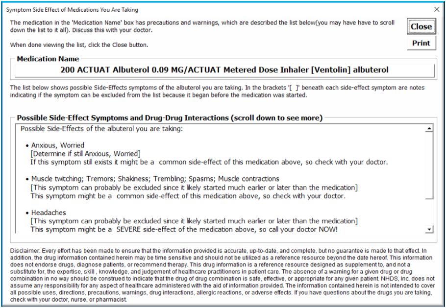 The upper first image below show a prototype tool that presents changes in a person's medications in a simple and clear view whenever a new list of medications is integrated into an existing (original) list. The bottom two images show how the tool collects data about a person's symptoms (lower bottom image) and associates them with possible side-effects of medications the person is taking. Both prototypes use common medication standard clinical drug vocabulary.