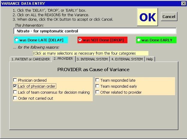 A clinical pathway (care pathway, integrated care pathway, critical pathway, or care map) is a tool used to manage healthcare quality through standardization and tracking of care processes. The first image shows part of the initial assessments that helps determine the severity of the patient’s condition and then presents the series of recommended, time-dependent interventions of which one was not completed are recommended (i.e., it was "at variance"). The second image is the form used to collect details about interventions at variance. And the third is one of the aggregate outcome reports.