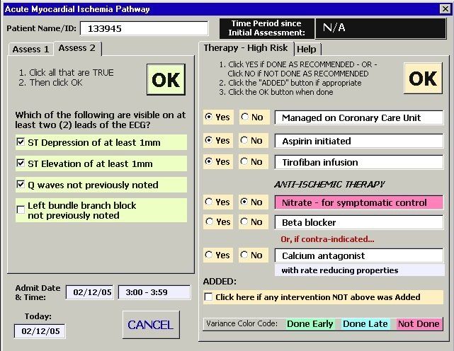 A clinical pathway (care pathway, integrated care pathway, critical pathway, or care map) is a tool used to manage healthcare quality through standardization and tracking of care processes. The first image shows part of the initial assessments that helps determine the severity of the patient’s condition and then presents the series of recommended, time-dependent interventions of which one was not completed are recommended (i.e., it was "at variance"). The second image is the form used to collect details about interventions at variance. And the third is one of the aggregate outcome reports.