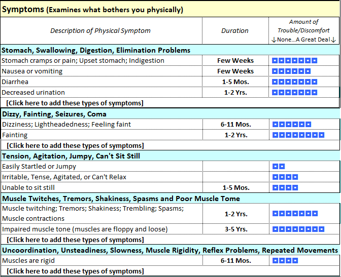 The upper first image below show a prototype tool that presents changes in a person's medications in a simple and clear view whenever a new list of medications is integrated into an existing (original) list. The bottom two images show how the tool collects data about a person's symptoms (lower bottom image) and associates them with possible side-effects of medications the person is taking. Both prototypes use common medication standard clinical drug vocabulary.